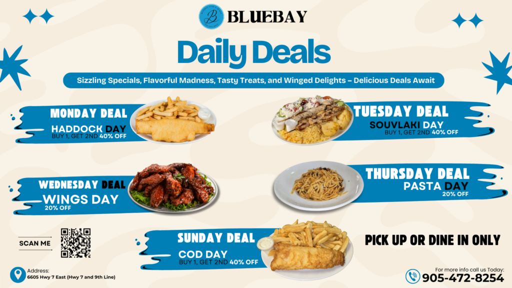 Welcome to Blu Bay Fish Wings, where flavor meets quality! We specialize in serving mouthwatering seafood and fast food dishes crafted with fresh ingredients and passion. From our signature Chicken Wings to the Mediterranean-inspired Pork Souvlaki Dinner, every item on our menu is designed to delight your taste buds. Whether you’re dining in or taking out, we’re here to make every meal memorable. Experience the best of seafood and fast food at Blu Bay Fish Wings — your ultimate destination for great taste!
